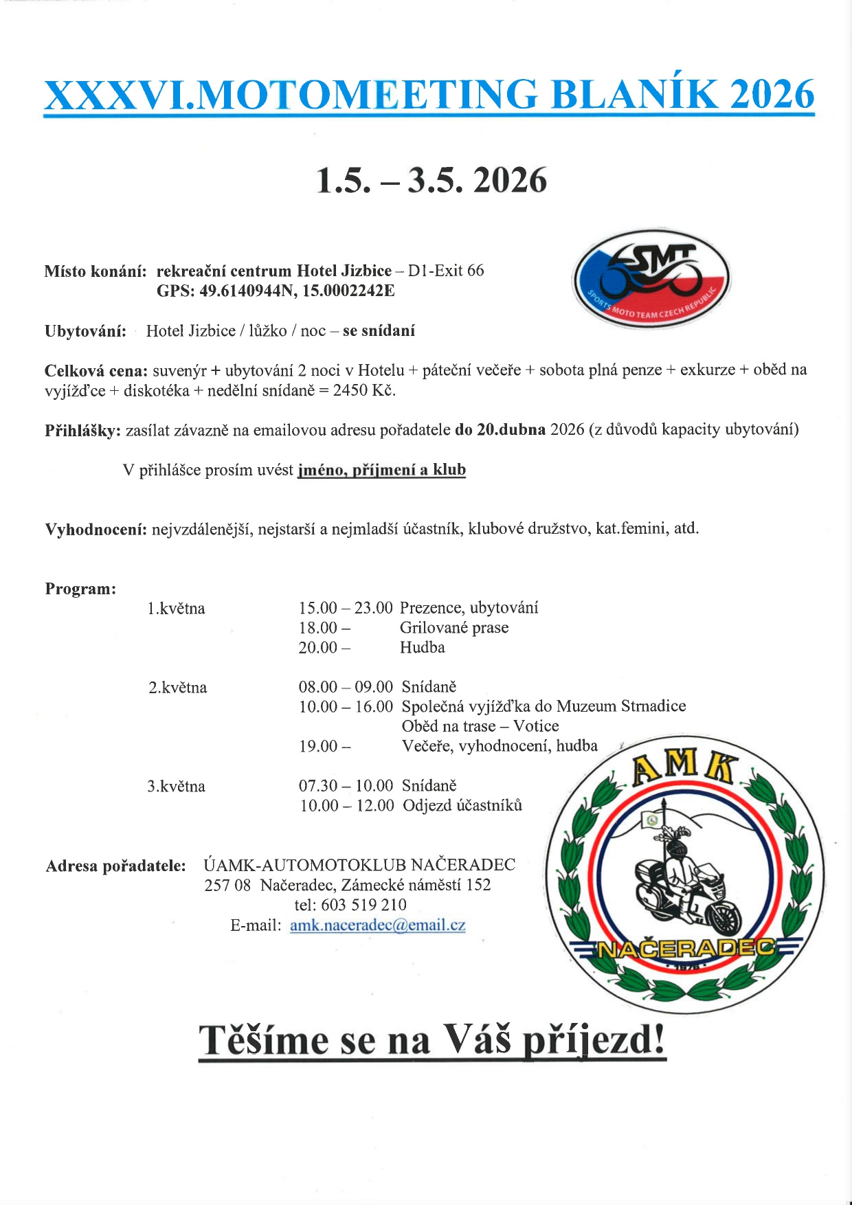 Date 01. - 03.máj 2026 Time All Day ŠMT – M SR v bodovacej súťaži mototuristiky, XXIII. Motomeeting Blaník (Jizbice ČR) Share this event + Add to Google Calendar + iCal / Outlook export 00 days 00 hours 00 minutes 00 seconds